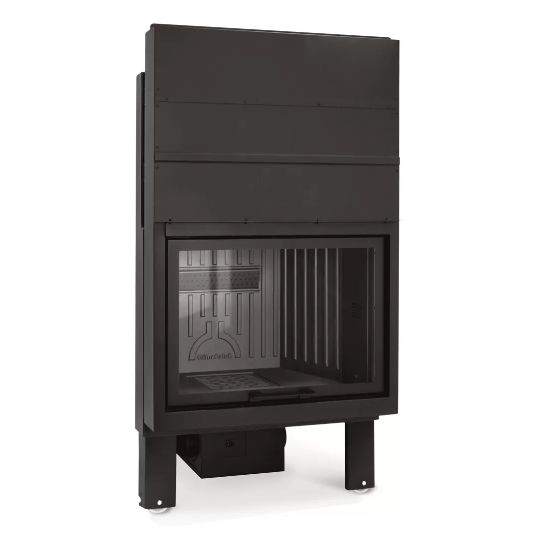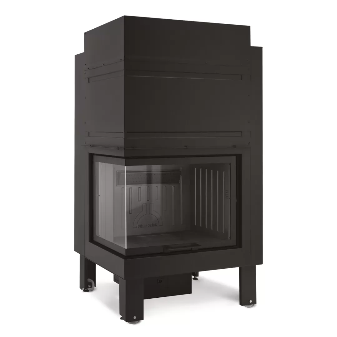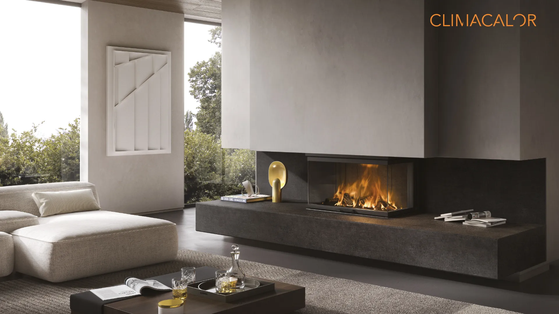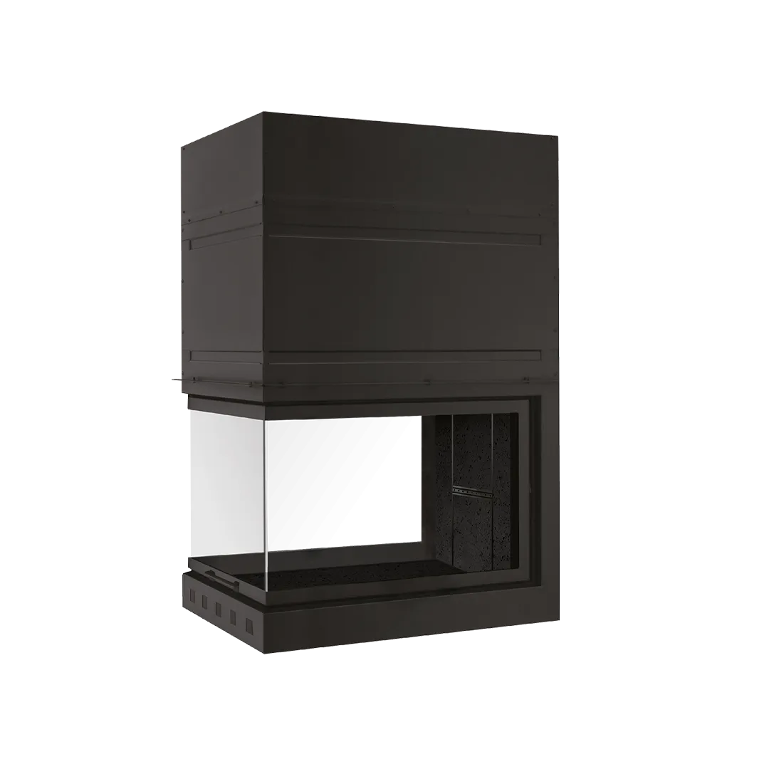 Γυάλινο τζάκι τριών όψεων με θάλαμο καύσης Terranera και συρόμενη πόρτα.